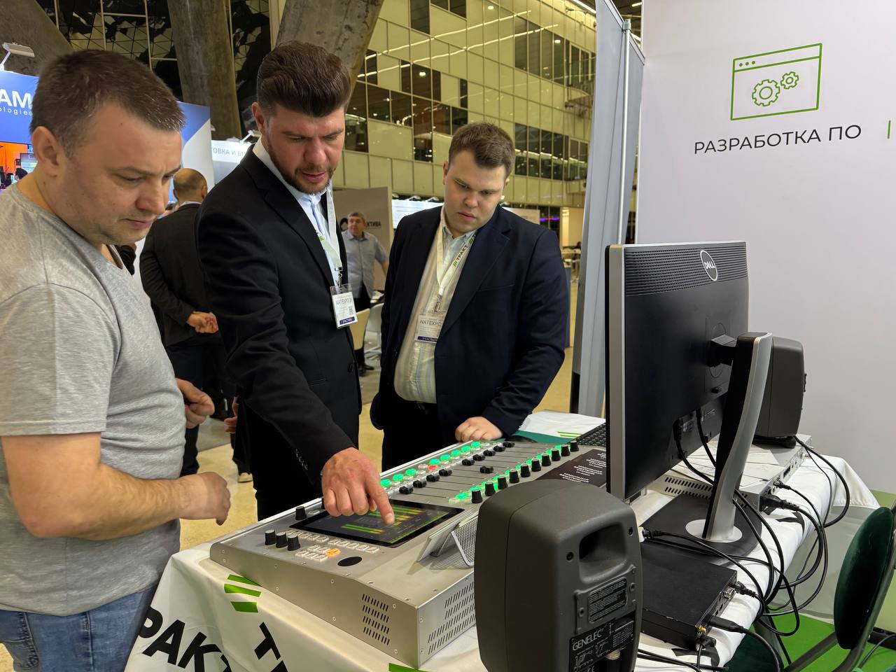 В декабре поехали на выставку NATEXPO в Сколково. Там с гордостью представили два главных изобретения года: модульную вещательную станцию ТР‑900М и микшерный пульт «Синерджи М». К слову, в гостях нашего стенда побывал генеральный директор НТВ.